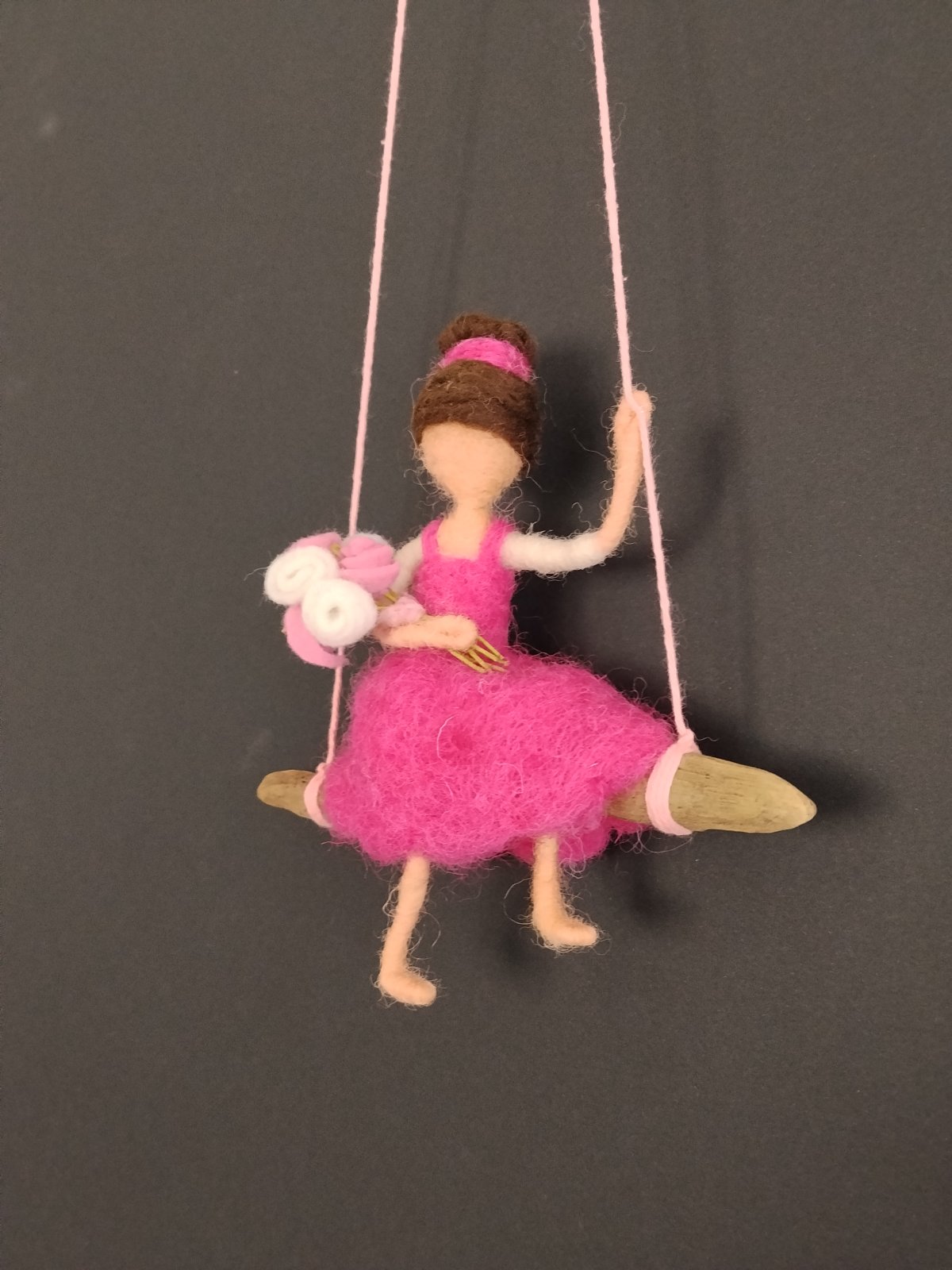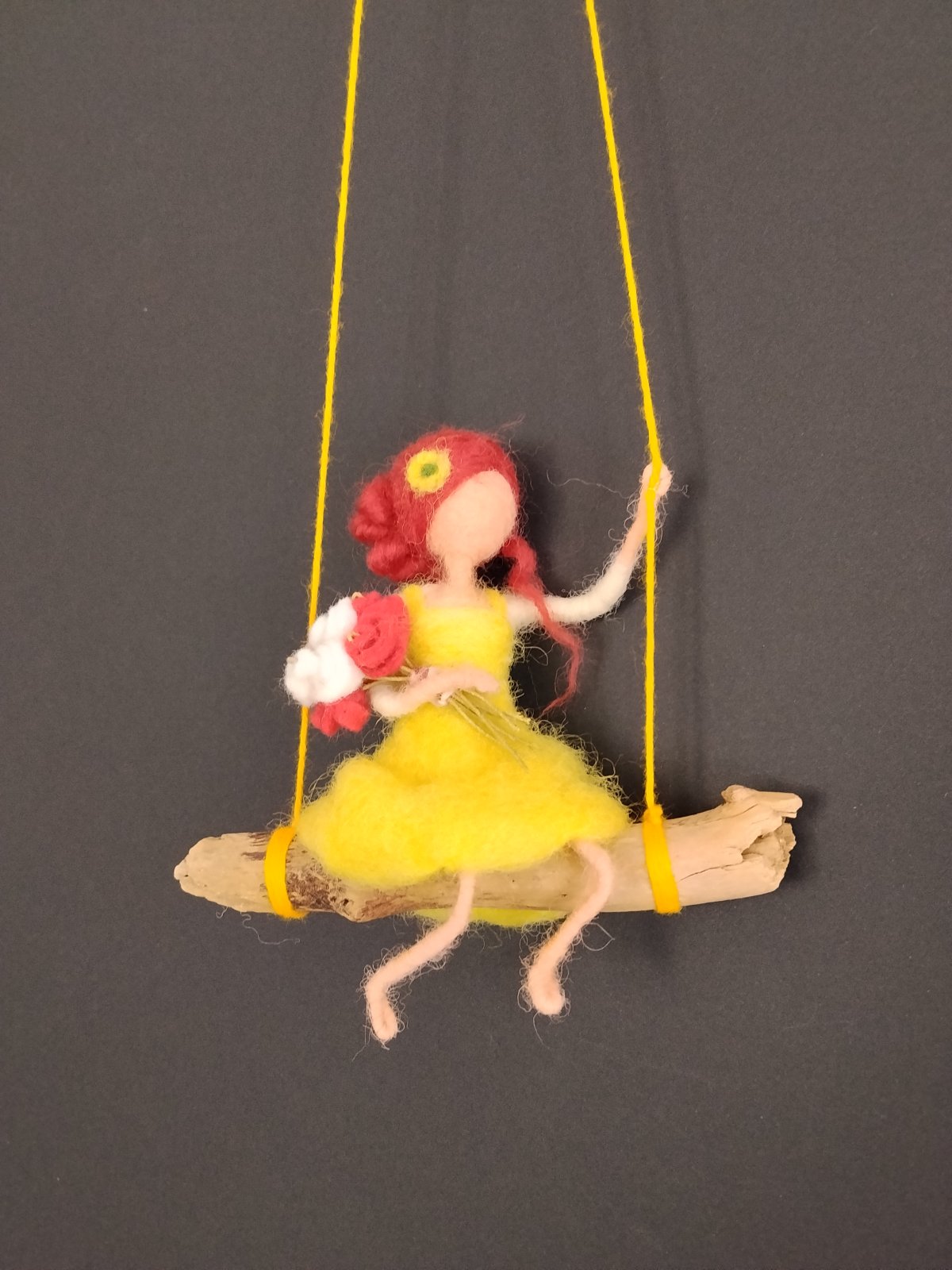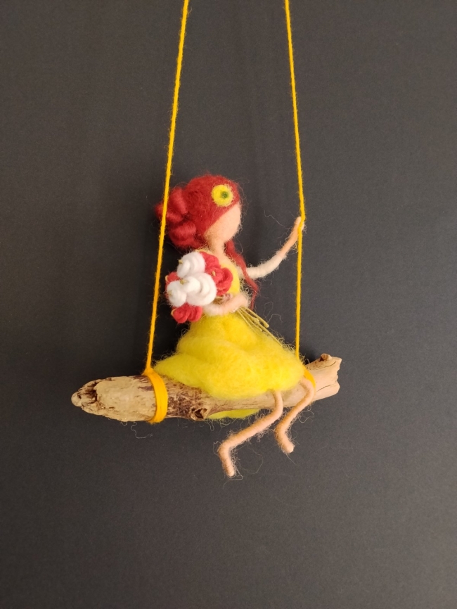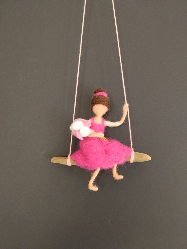 Suspension déclinée en jaune ou en rose, où chaque jeune fille se balance avec grâce sur son siège en bois flotté, serrant contre elle un bouquet de roses délicatement confectionné.