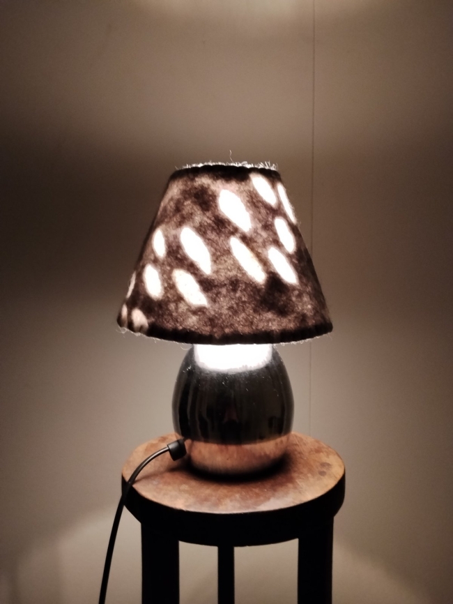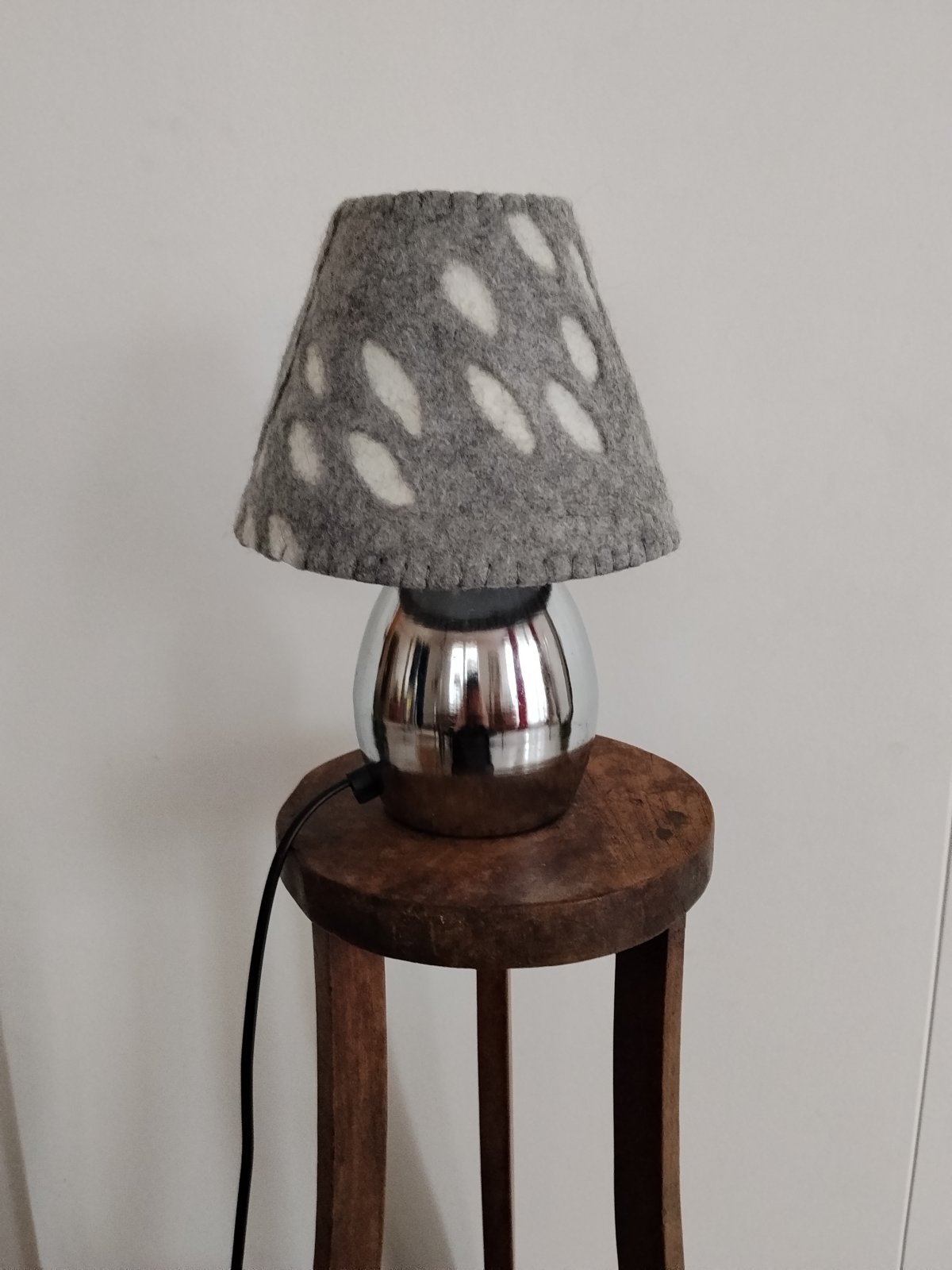 Un pied arrondi, trouvé et sélectionné pour sa silhouette. Surmonté d’un abat-jour cylindrique en laine feutrée humide. La lumière traverse les variations de densité et les motifs irréguliers du feutre, créant une ambiance douce et tamisée. L'ensemble fait de cette lampe un objet original.